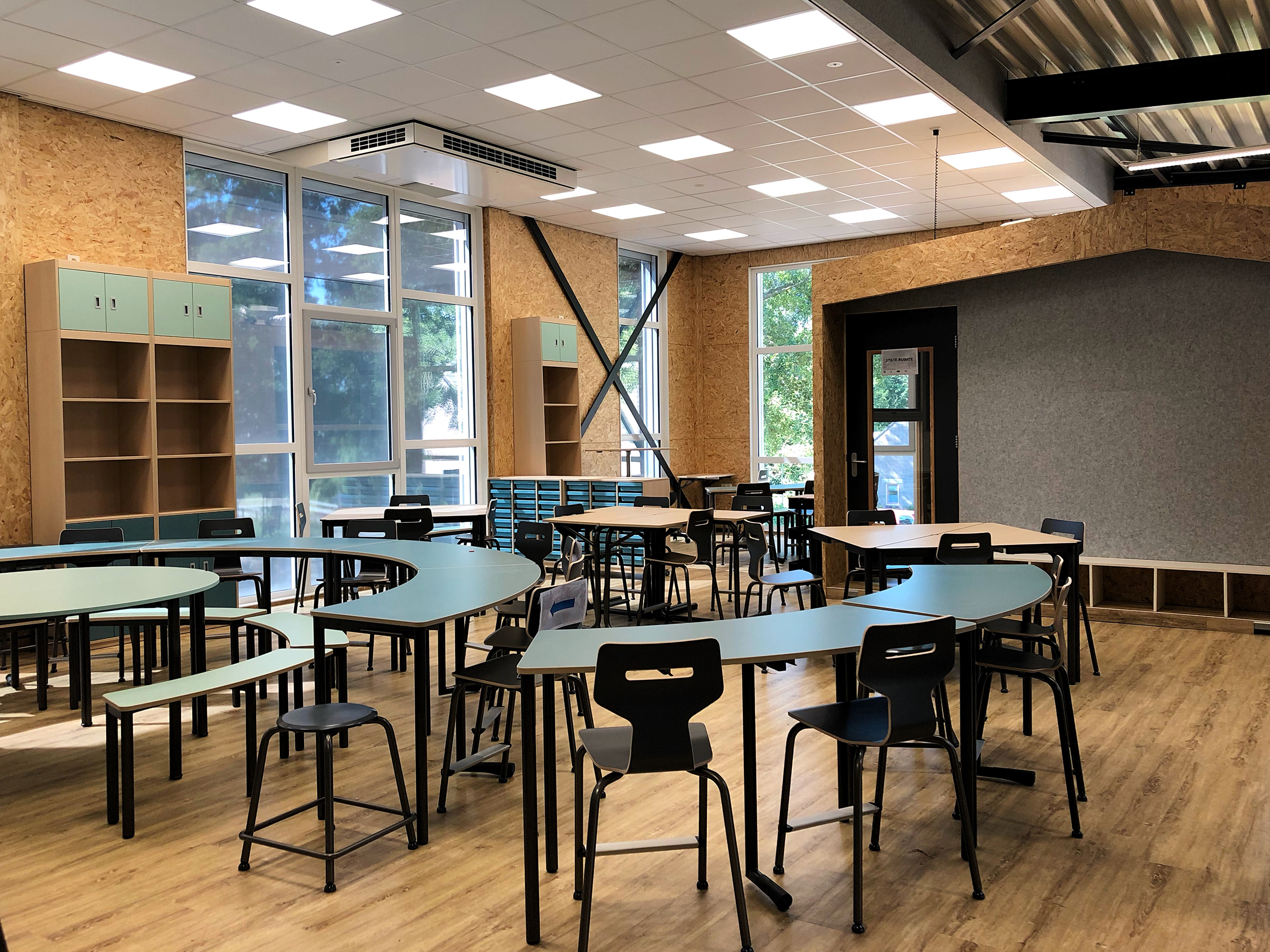 Het rechthoekige en met witte en lichtgroene tinten afgewerkte kindcentrum is nu een jaar in gebruik en functioneert naar volle tevredenheid, al kun je in Corona-tijd nog steeds niet helemaal van normale bedrijfsvoering spreken. Boeijink: “We kunnen al wel constateren dat de school beduidend minder energie verbruikt dan voorzien, en dan is het energiegebruik tijdens de bouw nog inbegrepen. Dat is onder meer bereikt met een luchtdichte schil, 308 zonnepanelen op het platte dak en 23 decentrale Airmaster ventilatie-units die in capaciteit variëren van 300 tot 1000 m3 per uur.”