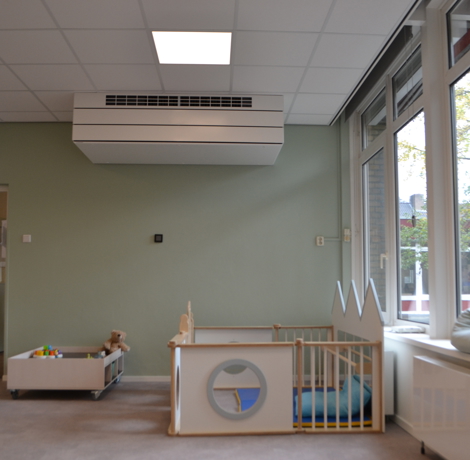 “De ramen openzetten is natuurlijk de makkelijkste manier van ventileren”, weet Jean-Paul Pil, projectadviseur bij Airmaster. “Om de ventilatie écht op orde te krijgen echter, in alle seizoenen, zijn structurele maatregelen nodig. Kinderdagverblijven zorgen hierbij voor een specifieke uitdaging, omdat bezettingen sterk verschillen. De kinderen worden op verschillende tijden gebracht en gehaald en brengen vaak een groot deel van de dag buiten door, afhankelijk van het seizoen en weer. Dit leidt tot uiteenlopende bezettingen én ventilatiebehoeften. Niet elke ruimte wordt immers even frequent gebruikt. Zo worden speelruimtes bijvoorbeeld actiever en door meer kinderen gebruikt dan slaap- en verschoonruimtes. Met onze decentrale ventilatie-units met warmteterugwinning bieden we voor al deze behoeften een passende, vraaggestuurde oplossing.”
