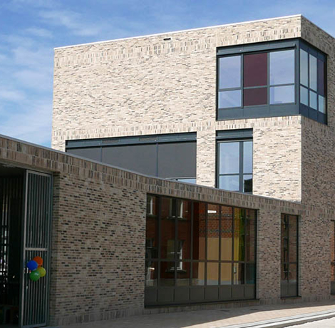 Architect Emile Smets van a33: “We kozen voor een ontwerp met een klassenvleugel op de straathoek, die drie bouwlagen telt. Dankzij zijn horizontale geleding blijft het gebouw op schaal van de omgeving. We realiseerden dit door het lichtkleurige baksteenmetselwerk af te wisselen met banden in verticaal donker metselwerk én de gevel verticaal te moduleren naar de meanderende straat. Op de hoek plooit hij terug, wat het ruimtegevoel en de verkeersveiligheid ten goede komt. Daarnaast bevindt zich een volume met polyvalente zaal en refter, die fungeert als schakel met de achtergelegen kleuterschool.”