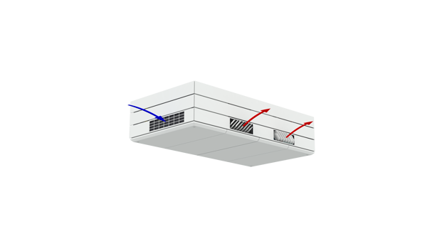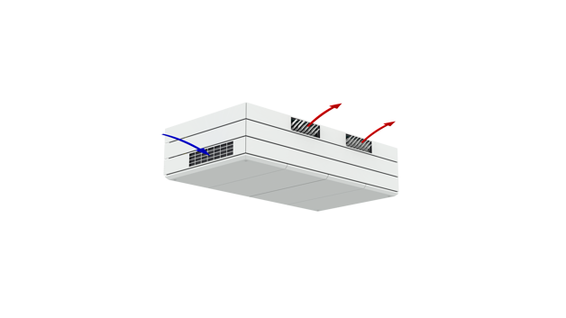 Het inblaasrooster van de AM 1000 is in twee gedeeld, waardoor de lucht via 2 aparte stralen de ruimte ingeblazen wordt. Het Adaptive Airflow-principe gebruikt het plafond en stromingstechnische principes om de worp aan te passen aan het gevraagde luchtvolume. Op die manier kan een constante worp, met een groot interval in stand worden gehouden en kunnen problemen met tocht vermeden worden.