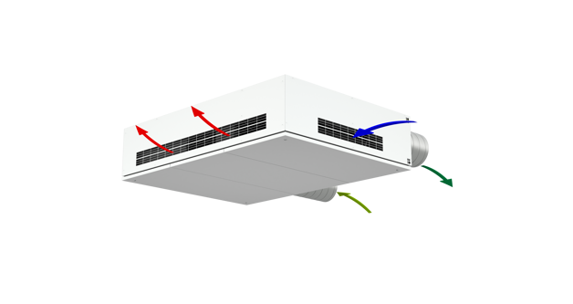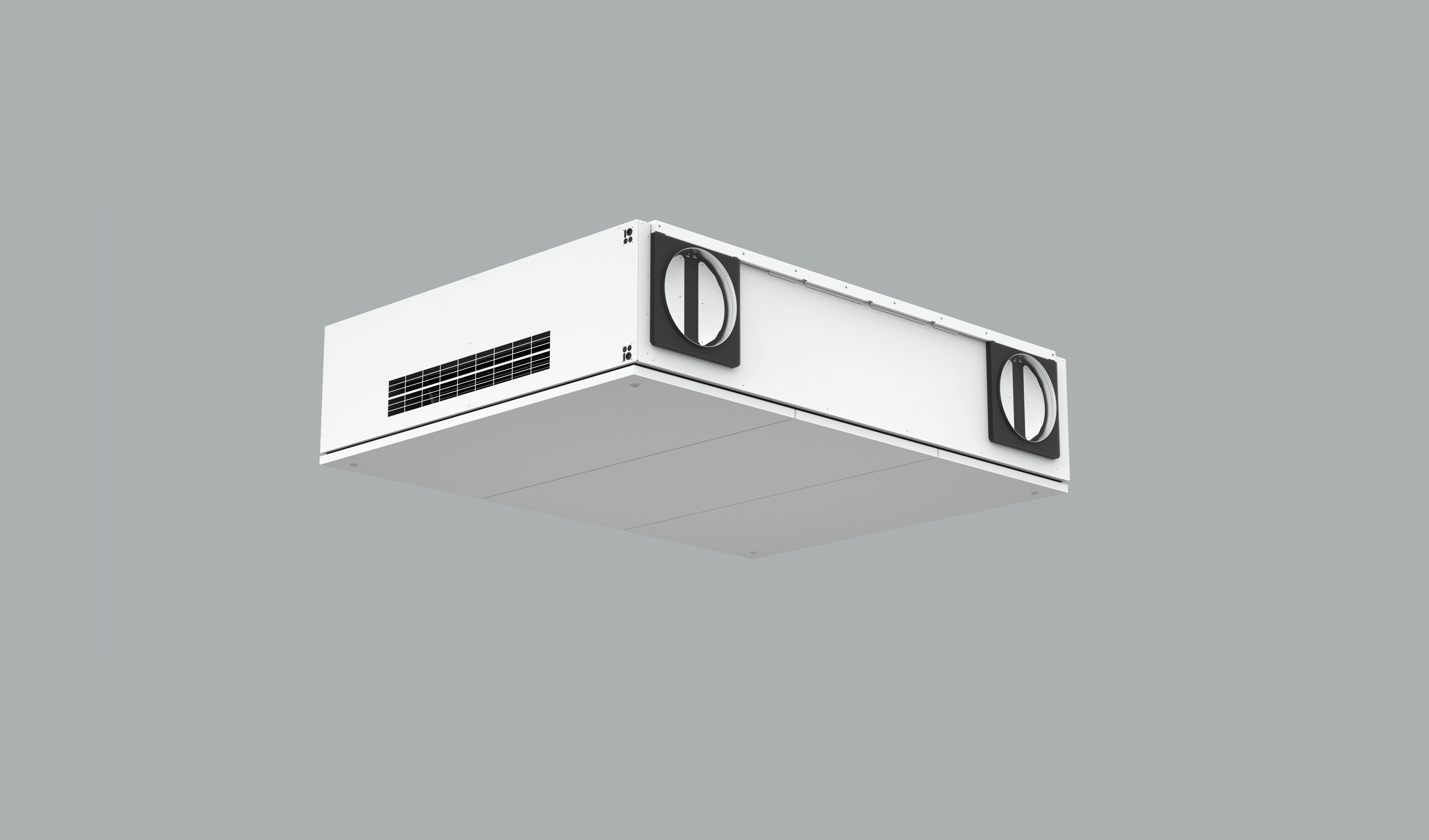Deze wandventilatie-eenheid is ideaal voor ruime ruimtes zoals klaslokalen en speelkamers. Het ontwerp in klassiek wit integreert volledig zichtbaar in het plafond of gedeeltelijk geïntegreerd in het verlaagde plafond.